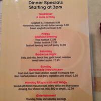Starters & appetizerssaladsburgers & sandwichesbrick oven pizzasentrees starting at 3pm. The regular menu was quite large, but all four of us wanted the bbq ribs. Can't go wrong with haddock special, fried chicken special and lasagna.